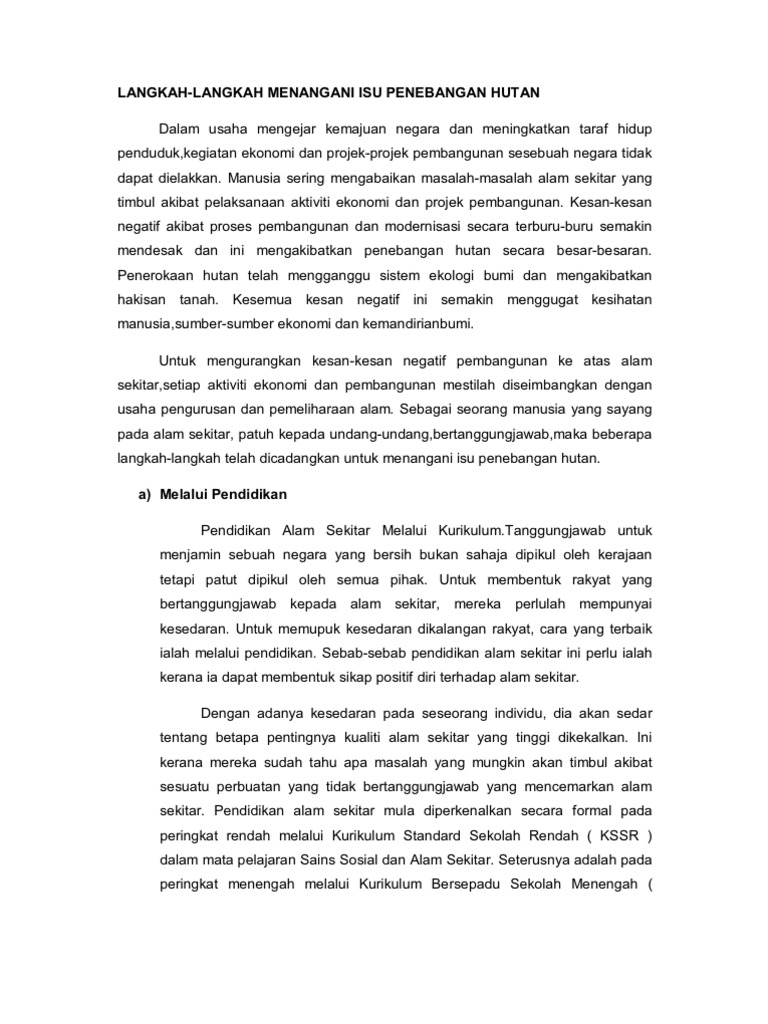 Langkah untuk mengatasi masalah kepupusan flora dan fauna ialah menghenti kan pembalakan haram kerajaan juga seharusnya mengambil tindakan dengan mendenda mna mna orang yg mengakibat kan kepupusan flora dan fauna menyedia kan notis pemberitahuan. Hal ini adalah bagi memastikan para pembalak agar tidak menyalahgunakan. Pengarahnya, roslan rani, berkata lelaki tempatan berusia 26 tahun. Pengeluaran atau pelulusan lesen bagi tujuan pembalakan turut perlu diminimumkan. Pembalakan haram di hutan simpan harus dihentikan di sabah these pictures of this page are about:pembalakan. Pembalakan haram di ulu muda jejaskan kualiti air? Pembalakan haram mampu menyumbang keapada terjadinya bencana alam. Contextual translation of langkah langkah mengatasi pembalakan haram into english. A.penggunaan teknologi moden penggunaan teknologi moden untuk mengurangkan pencemaran alam sekitar adalah amat penting.sebagai contohnya, tanpa teknologi moden, adalah tidak mungkin untuk membersihkan. Tiada pembalakan haram sekala besar di kelantan. Hutan merupakan khazanah dunia yang amat bernilai. Saban hari, kita sering mendengar isu remaja yang tidak pernah habis diperkatakan. Pembalakan haram dan pembalakan yang tidak dikawal boleh menyebabkan kemusnahan ekologi hutan yang boleh membawa kepada perubahan suhu setempat.